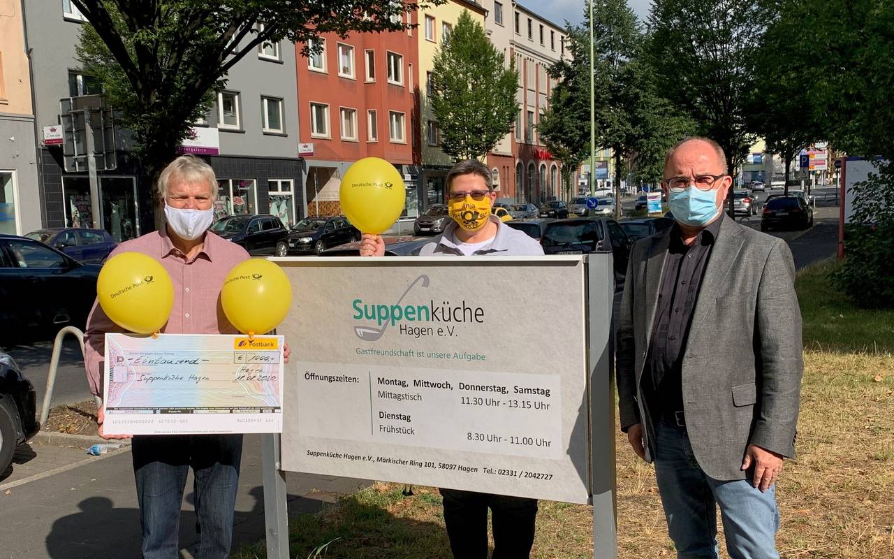 Normalerweise bekommen Bedürftige in der Suppenküche täglich eine warme Mahlzeit. In Zeiten von Corona gibt es nur an zwei Tagen eine Kaltverpflegung. Die Deutsche Post spendet 1.000 Euro, die in die Schutzmaßnahmen fließen sollen. Mit dem Geld sollen zum Beispiel Plexiglas-Trennwände oder recyclebares Einmalgeschirr gekauft werden. Die Deutsche Post stellt außerdem Techniker, die bei der Montage helfen werden.