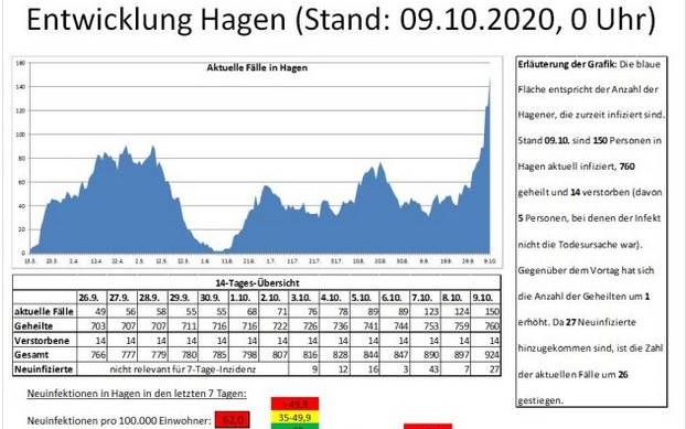 Wichtiger ist aber eine andere Kennzahl. Sie berechnet die Infizierten innerhalb von sieben Tagen auf 100 000 Einwohner. Und da liegt Hagen mittlerweile bei 62,0. Gestern waren es 55,6 – der Alarmwert liegt bei 50,0.