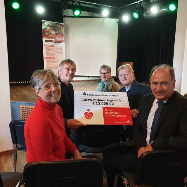 Die Sparkasse überreichte einen Scheck über 15.000€, eine Förderung durch die Sparkassenstiftung. Das Geld fließt in die Modernisierung des Veranstaltungssaals, der regelmäßig für Veranstaltungen verschiedener Hagener Gruppen und Vereine genutzt wird. Ulrich Korflür vom AllerWeltHaus freut sich über die Neuerungen.