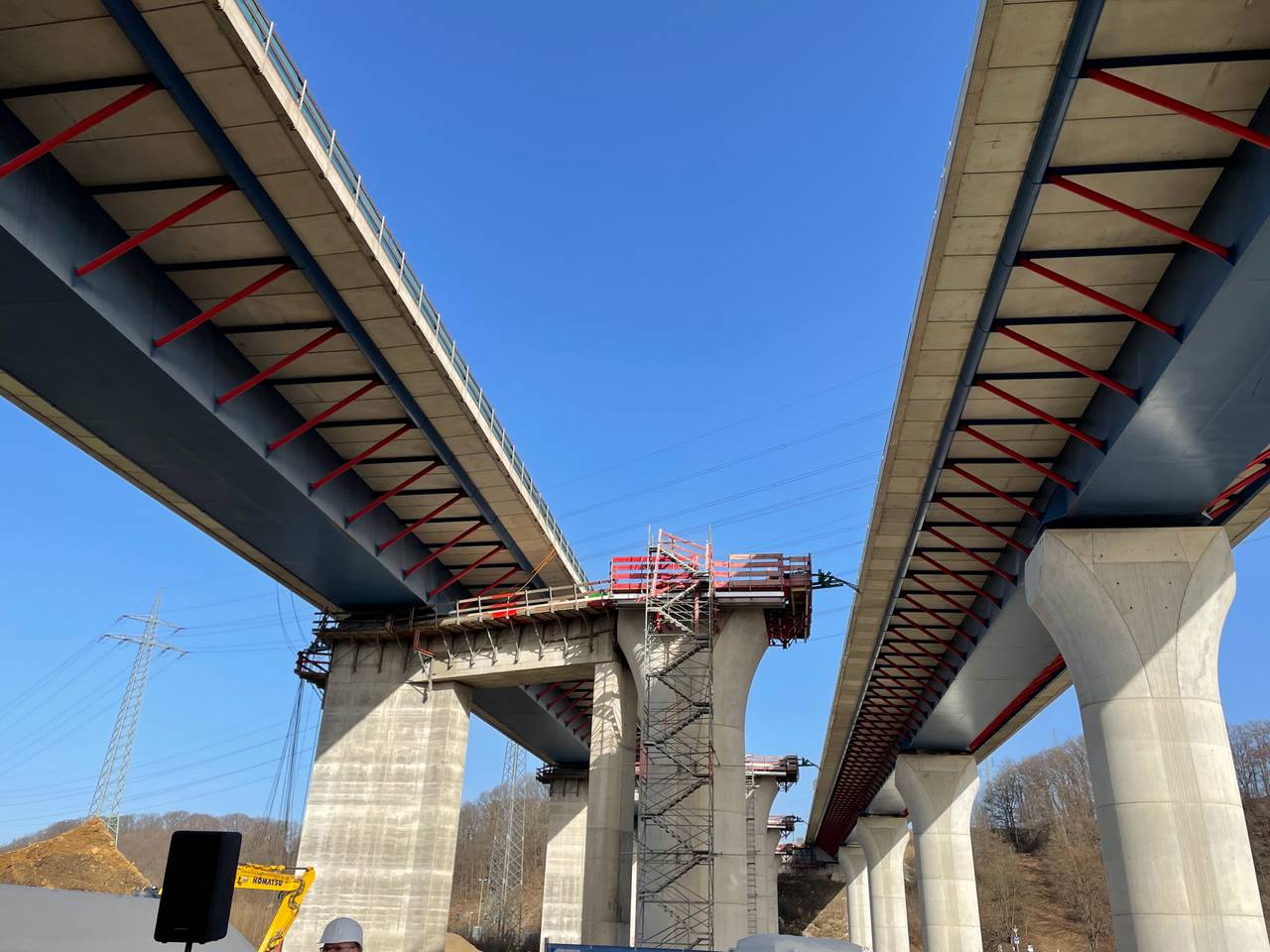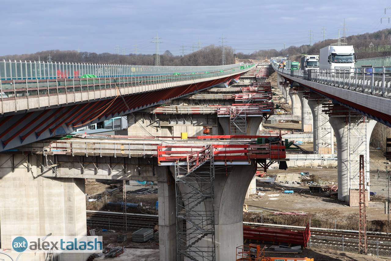 Die Technik der Brückenschubserei ist eigentlich nichts neues, aber in dieser Dimension dann doch bundesweit einmalig. Man hat neben der alten Brücke eine neue gebaut. Wenn man direkt darunter steht, bekommt man erst ein Gefühl für die Massen, die da bewegt werden. Dieses rund 1000 m lange neue Stück wird am fünften März hydraulisch verschoben. Ganz genau heißt das: Hydrauliken ziehen mit Stahllitzen den 30 000 Tonnen schweren Brückenkörper. Das funktioniert so ähnlich wie Tauziehen. Die Brückenpfeiler für die neue Brücke haben extra eine Art Rutschbahn bekommen: Fast 20 Meter wird das ganze mächtige Stück Autobahnbrücke dann über einen Tag lang an seine Position gezogen.