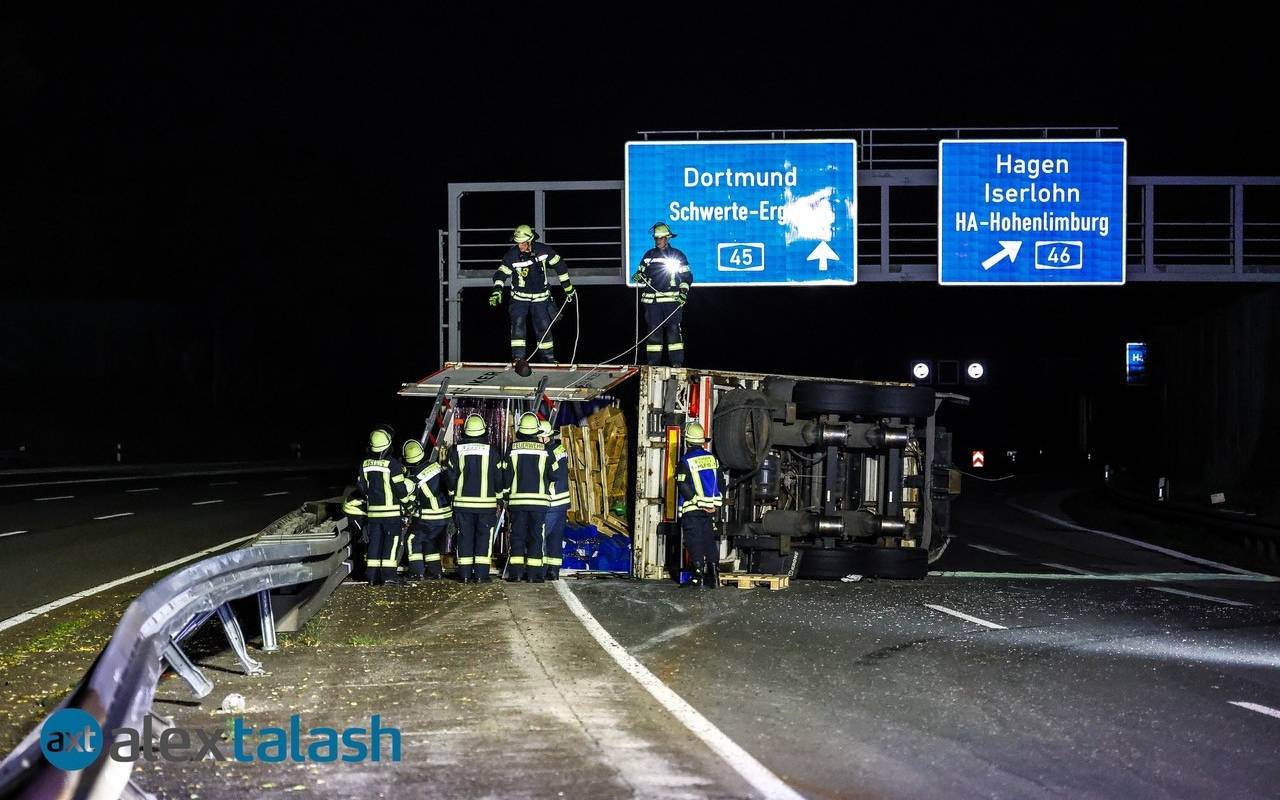 Der Lastwagen transportierte neben Stückgut auch Kanister mit Gefahrgut. Die Feuerwehr rückte mit einem Großaufgebot an, um eine mögliche Umweltgefahr zu verhindern. Ein Spezialunternehmen wurde mit der Bergung beauftragt, zudem zogen die Einsatzkräfte Chemiefachberater hinzu, um den sicheren Umgang mit den gefährlichen Stoffen zu gewährleisten. Die Autobahn in Fahrtrichtung Dortmund musste vollständig gesperrt werden. Die Sperrung dauert zur Stunde noch an. Wie lange der Einsatz noch andauern wird, ist derzeit unklar. Autofahrer und LKW-Fahrer, die in der Vollsperrung standen, mussten bis zu zwei Stunden in ihren Fahrzeugen ausharren, bevor sie unter Begleitung zurückgeführt wurden. Mit einer vollständigen Freigabe der Strecke ist erst nach Abschluss der Bergungs- und Reinigungsarbeiten zu rechnen.