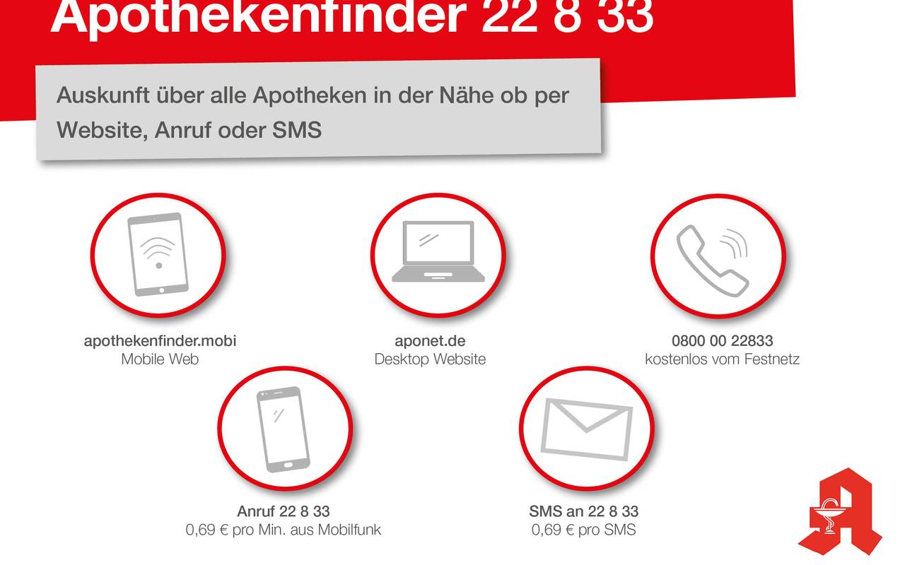 Medikamente gibt es bei den Notdienstapotheken. Auf der Grafik zum Text werden verschiedene Möglichkeiten gezeigt, zu erfahren, welche Apotheken geöffnet sind.