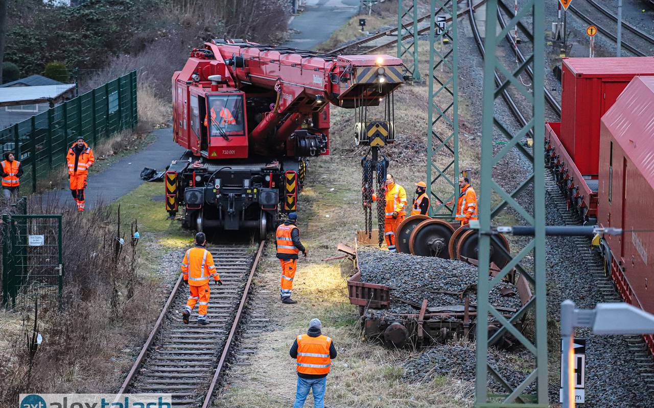 Der Güterwagen stand ohne Achsen zwischen zwei Gleisen. Die Deutsche Bahn hat am Wochenende den Spezialkran „Bulldog“ eingesetzt. 110 Tonnen kann das Gerät heben, der entgleiste Waggon wurde auf einen Tieflader verfrachtet. Für die Aktion am Samstag mussten ein Gleis in Hohenlimburg gesperrt und die Züge nach Hagen zeitweise umgeleitet werden.