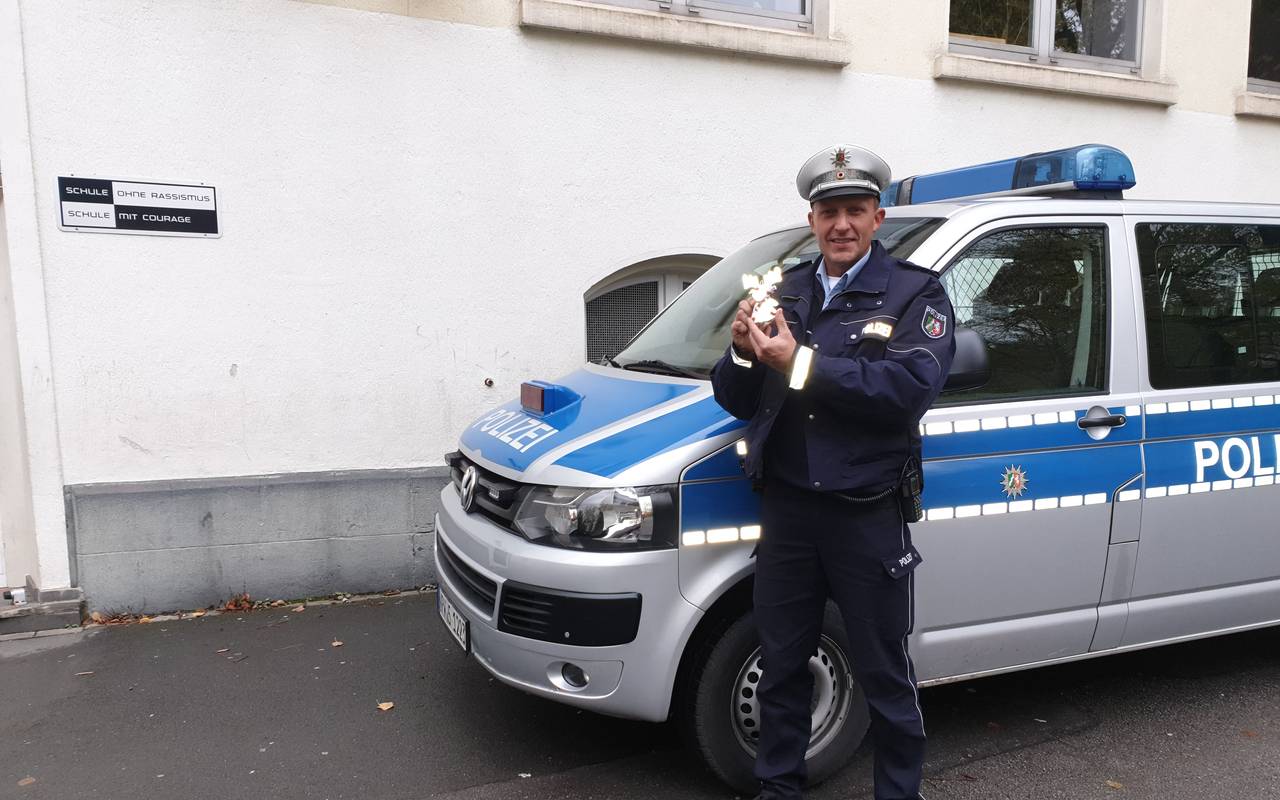 Und dafür dass die Schüler dabei auch für die Autofahrer gut zu sehen sind, sorgt unser Schutzelch Emil. Er wird zum Beispiel an der Jacke oder dem Tornister angebracht. Wird er dann von einem Autoscheinwerfer angeleuchtet, reflektiert er das Licht und macht so auf die Kinder aufmerksam. Gerade jetzt in der dunklen Jahreszeit sind auch die Eltern gefragt, sagt Björn Freitag, Bezirkspolizist in Wehringhausen.