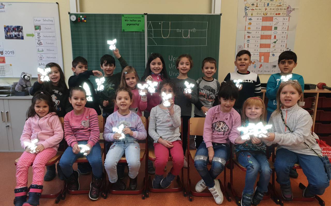 Rund 120 Erstklässler begleitet er dort ab sofort auf dem Weg zur Schule und sorgt dafür, dass sie für Autofahrer in der dunklen Jahreszeit besser zu sehen sind. Emil funktioniert wie ein Reflektor: wird er von einem Scheinwerfer oder einer Taschenlampe angeleuchtet, reflektiert er das Licht und leuchtet weiß. Das und noch viel mehr kommt auch bei den Schülern richtig gut an.