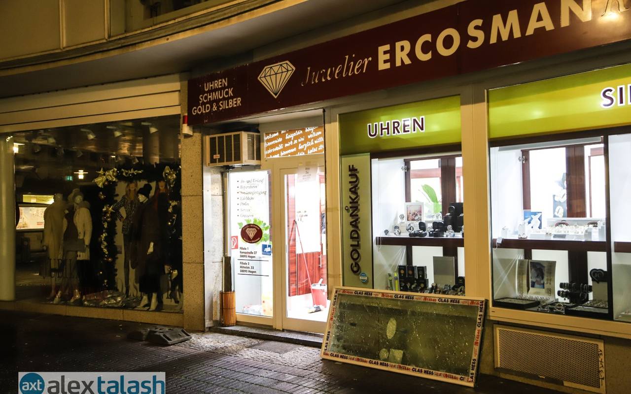 In der Nacht wurde der Juwelier Ercosman in der Hagener Innenstadt erneut das Ziel von Einbrechern. Im Laden an der Mittelstraße gab es bereits vor einigen Wochen einen Blitzeinbruch, heute gegen halb drei in der Nacht schlugen Unbekannte erneut zu.