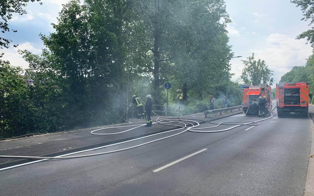 In Haspe hatte es die Feuerwehr heute Mittag mit einem Böschungsbrand zutun. Das Feuer hatte sich auf 200 Metern Länge ausgebreitet.