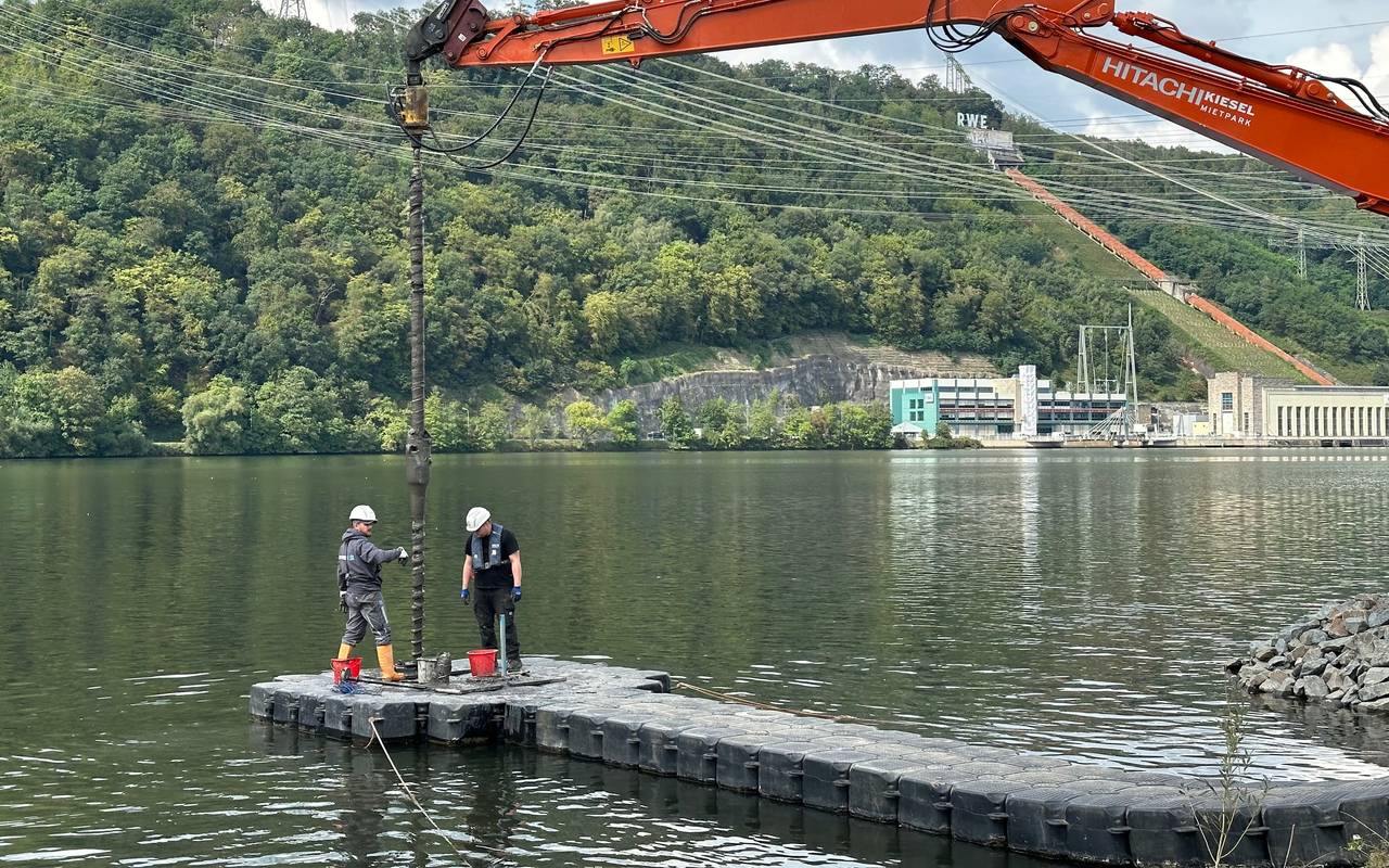 Eine Spezialfirma bohrt 6 bis 8 Meter lange Löcher in den ufernahen Hengsteysee-Grund. Anschließend wird ein Messinstrument in das Bohrloch geschoben, dass Metall erkennen kann. Bislang wurden noch keine Hinweise auf Blindgänger gefunden. Die Sondierungen laufen noch die ganze Woche lang. Der Beach Club mit Steg vom Strandhaus zum Hengsteysee-Ufer soll schon im kommenden Sommer eröffnet werden.