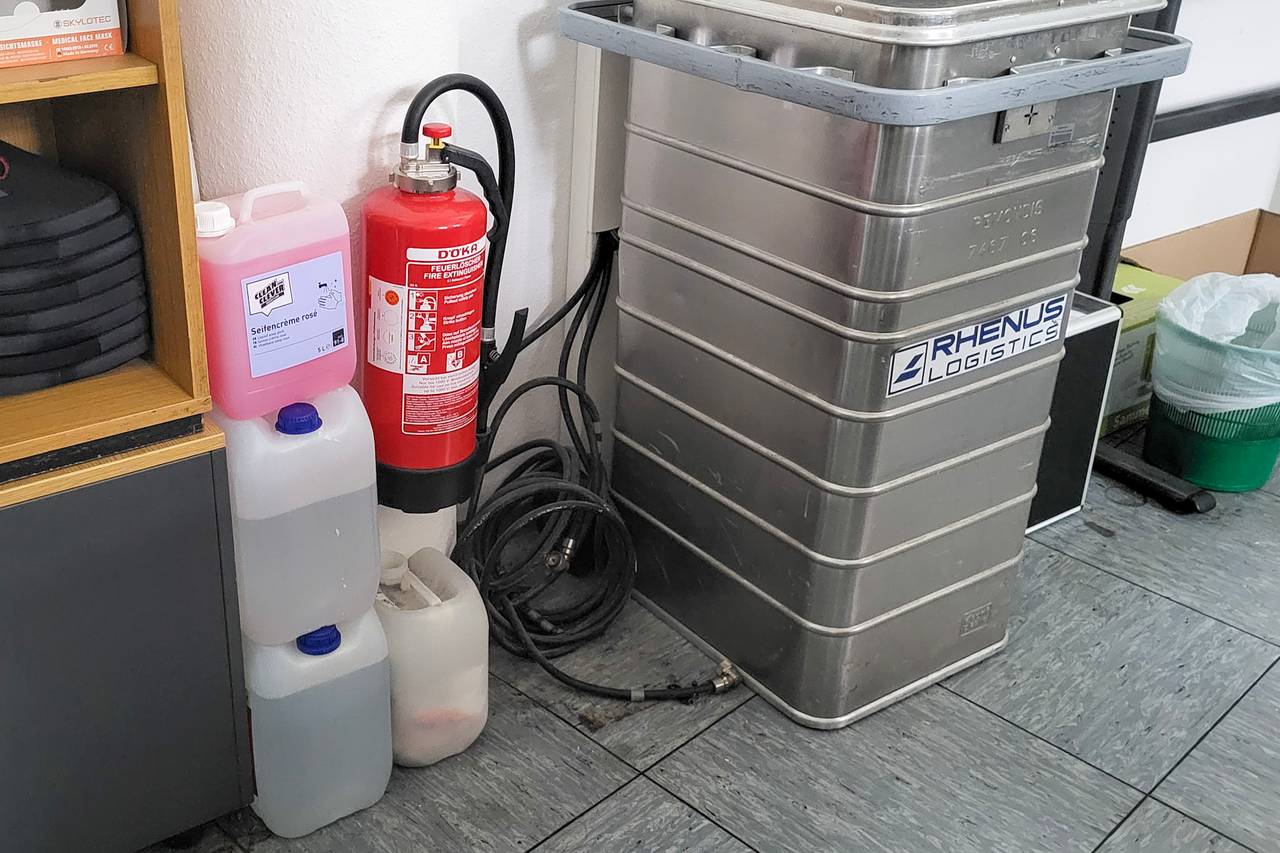 Die Wache verfügt über zwei Umkleideräume, einen kleinen im 1. OG und einen großen im Erdgeschoss. Die Umkleide im EG ist gleichzeitig der Sozialraum, in dem sich die Beamtinnen und Beamten in ruhigen Minuten zurückziehen und etwas essen können. Umziehen zwischen Kaffeetassen und Brotdosen, glücklich ist damit niemand. Die Toilettenräume sind inzwischen geschlechtergetrennt, erinnern von der Größe jedoch eher an eine Abstellkammer. Es gibt nur eine Einzeldusche für alle, die scheint jedoch durch die Enge und den Anschluss an den Sozialraum selten genutzt zu werden. Auch der Flur ist sehr eng, ein gleichzeitiges Durchgehen fast unmöglich. Eine Klimaanlage gibt es, die ist jedoch seit mehr als zehn Jahren außer Betrieb, so dass es im Sommer sehr heiß wird.