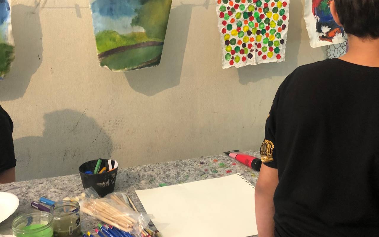 Kinder und Jugendliche ab zwölf Jahren konnten hier ganz frei ihre eigenen tibetischen Gebetsfahnen gestalten. Diese sind häufig in Tibet und Nepal zu sehen und sollen als Fläche für Wünsche oder Gebete dienen und sie somit raus in die Welt tragen.