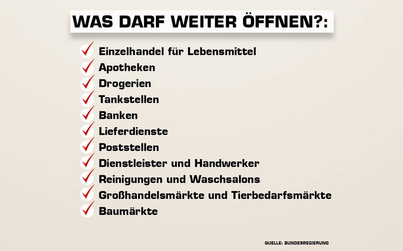 - Folgenden Geschäften ist bis weiteres auch die Öffnung an Sonn- und Feiertagen von 13 bis 18 Uhr gestattet (dies gilt nicht für Karfreitag, Ostersonntag und Ostermontag): Geschäften des Einzelhandels für Lebensmittel, Wochenmärkten, Abhol- und Lieferdiensten sowie Apotheken, außerdem Geschäften des Großhandels.