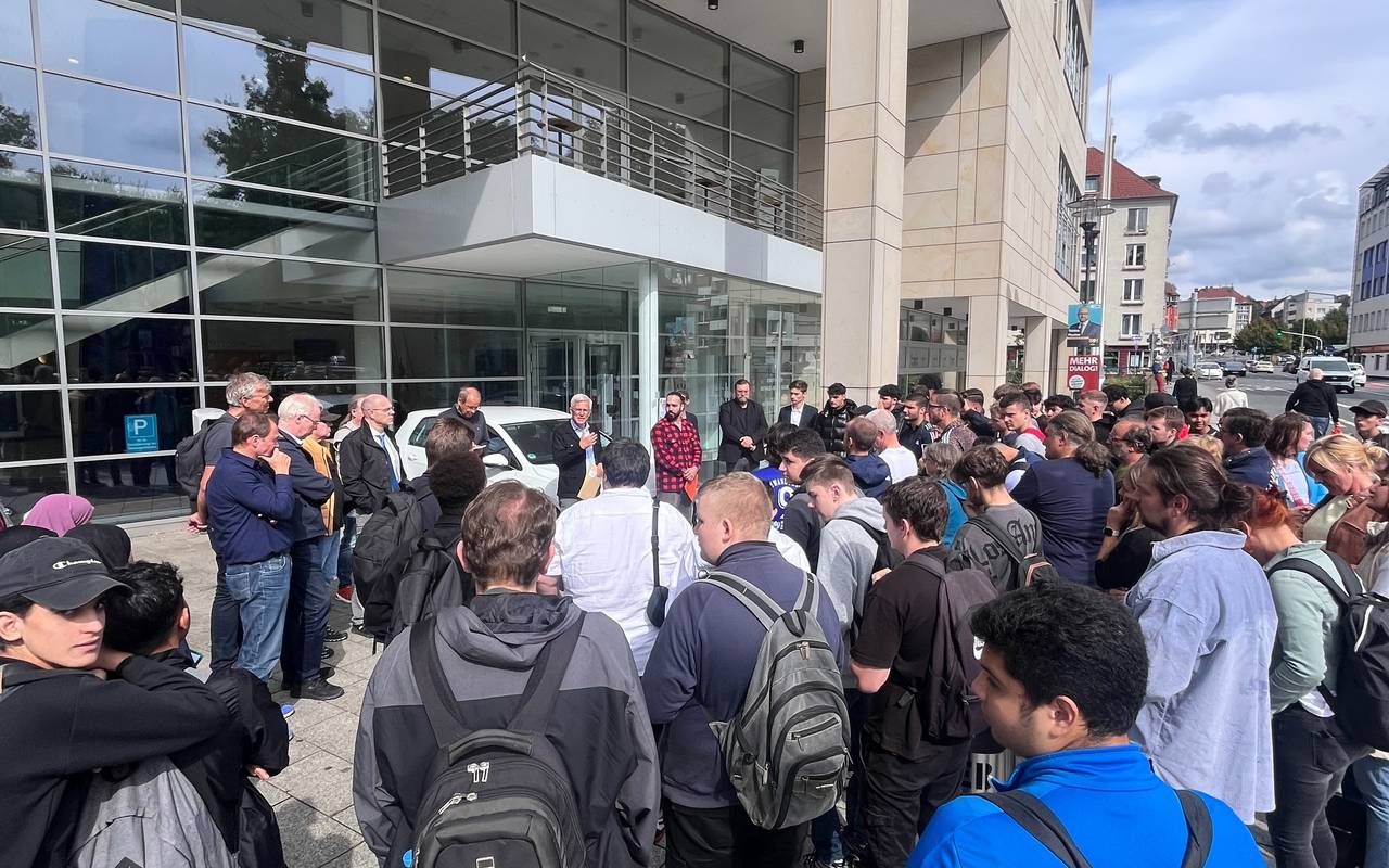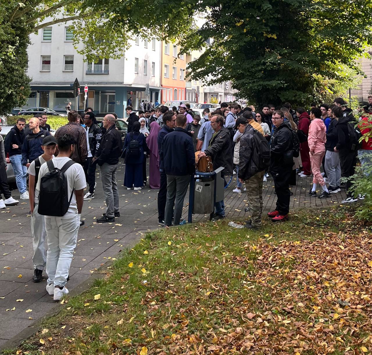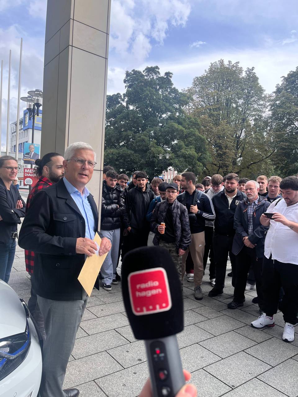 Das Cuno-Berufskolleg bleibt wegen massiver Brandschutzmängel geschlossen. Der Unterricht läuft nur eingeschränkt und ist größtenteils nur Online möglich. Heute (10.09.2025) hat sich die Schülervertretung mit dem Oberbürgermeister getroffen. Davor haben sich die Schülerinnen und Schüler vor dem Berufskolleg getroffen und sind zu Fuß zum Rathaus gegangen.