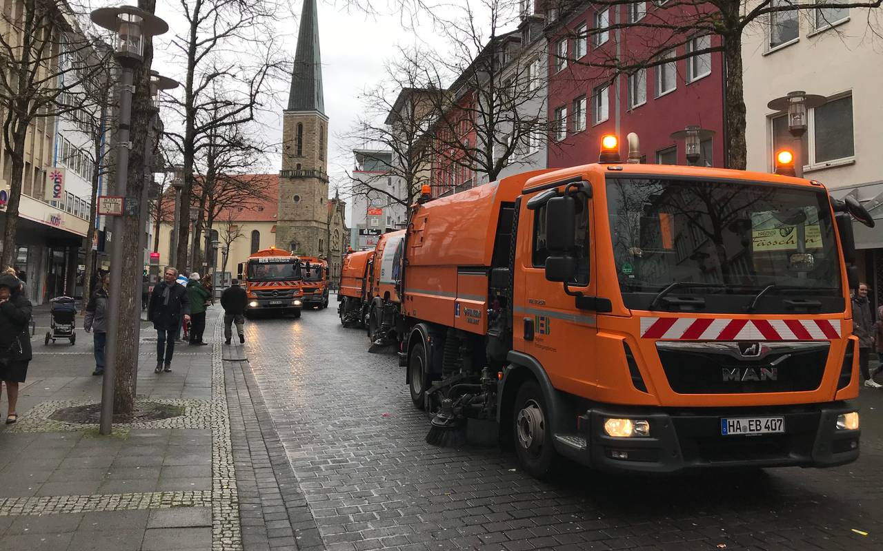 Beim Rosenmontagsumzug hatte gestern auch der HEB seinen großen Auftritt. Ganz am Ende beseitigte die Straßenreinigung die Überreste.
