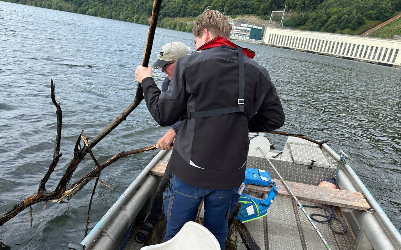 Der Ruhrverband hat am Dienstag mit Hagener Wassersportlern bei einem Ortstermin auf dem Hengsteysee Hindernisse für Wassersportler kartiert und - so weit möglich - direkt schon entfernt. Dabei handelt es sich in der Regel um Äste oder ganze Bäume, die von Hochwassern vorher mitgerissen worden sind.
