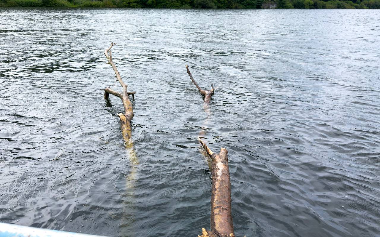Winter- und Frühjahrshochwasser haben vermehrt lose stehende Bäume und herumliegende Äste an den Ufern weggerissen - etliche davon sind dann im See stecken geblieben und lauern teils knapp unter der Wasseroberfläche.