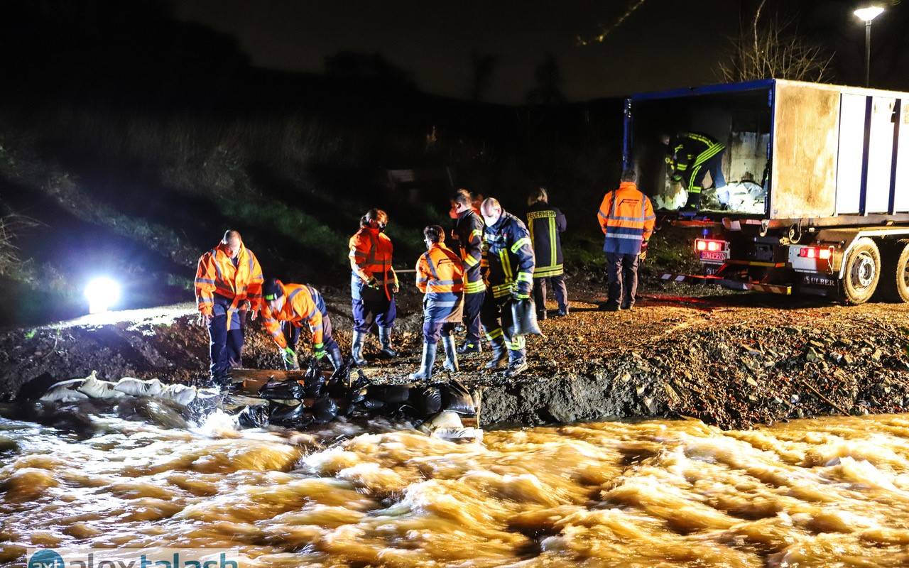 Anwohner hatten die Feuerwehr aus Angst vor erneuten Überflutungen verständigt. Feuerwehrleute verteilten Sandsäcke entlang des Bachlaufes. Anschließend wurde eine 15 Meter lange mobile Deichsperre aufgebaut. Die Gefahr war gebannt. Bereits mehrfach musste die Feuerwehr über den Tag ausrücken, um Treibgut von den Treibsel- und Geröllfängern zu entfernen.