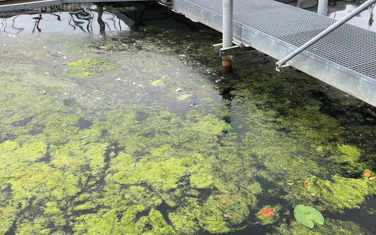 Der grüne Teppich kommt von der Wasserpflanze Elodea, die von meisten Anliegern an den Seen nur resigniert-wütend "Wasserpest" genannt wird.