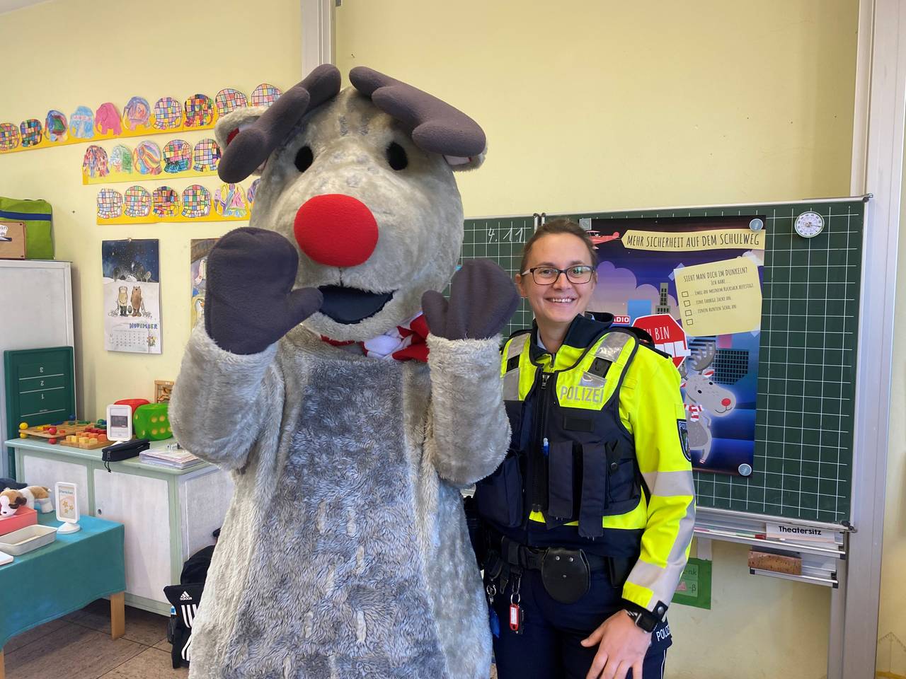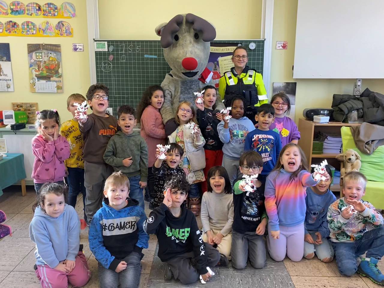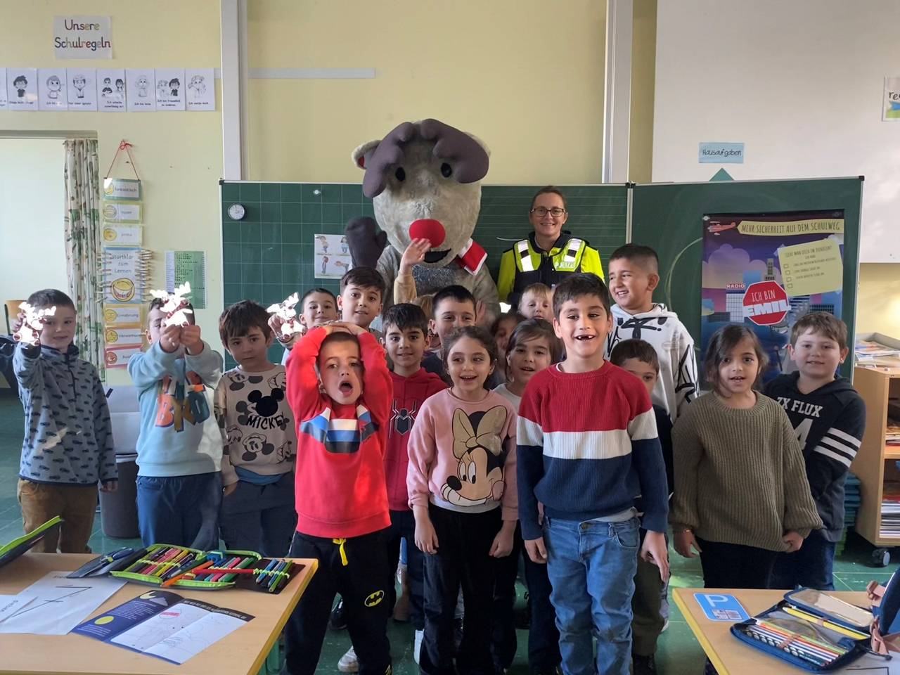 Heute (05.11) ist Tag 6 unserer Emil Aktion. Seit letzter Woche besuchen wir verschiedene Grundschulen in Hagen und sprechen mit den ersten Klassen über den Schulweg in der dunklen Jahreszeit. Für den kleinen Reflektor-Elch ging es heute dabei an die Vinckeschule. Und dort war es etwas anders als sonst. Wir hatten nämlich auch den Emil in Lebensgröße dabei. Den konnten die Kinder sogar knuddeln. Deswegen kam er auch sofort gut an.