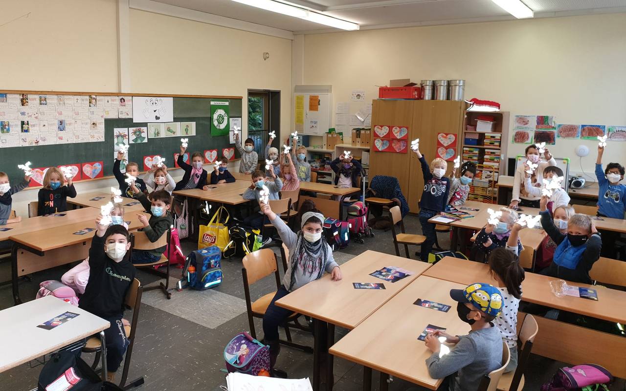 Und da hat jede Schülerin und jeder Schüler aus den ersten Klassen einen von unseren Reflektorelchen bekommen. Vorgestern war auch die Polizei in Emst, um den Schülerinnen und Schülern zu zeigen, wie man sich an der Straße verhält. Und da haben die Kids einiges bei mitgenommen.