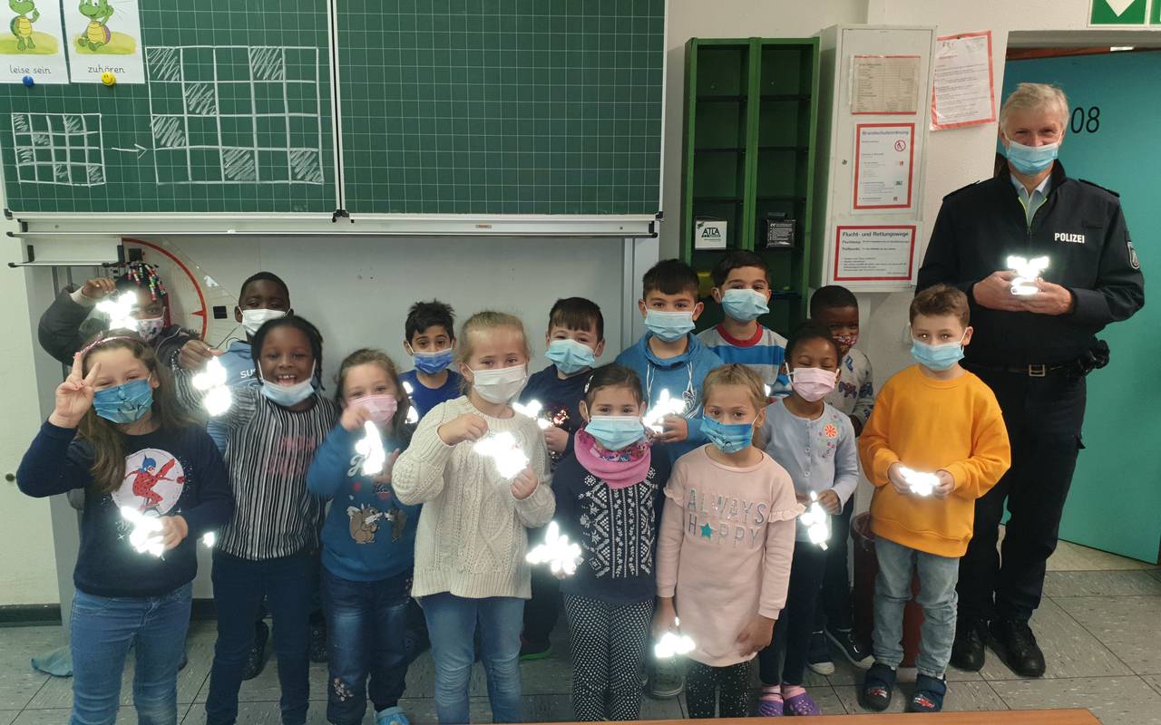 Emil ist ja unser kleiner Reflektor-Elch. Den macht man an der Kleidung der i-Männchen fest, damit sie besser sichtbar für Autofahrer sind. Und so sollen dann weniger Unfälle passieren. Dafür setzt sich natürlich auch die Polizei ein. Deshalb war heute auch Martin Oehlke von der Hagener Polizei mit dabei. Er betont vor allem, dass Eltern ihre Kinder mehr mit heller und reflektierender Kleidung ausstatten sollten.