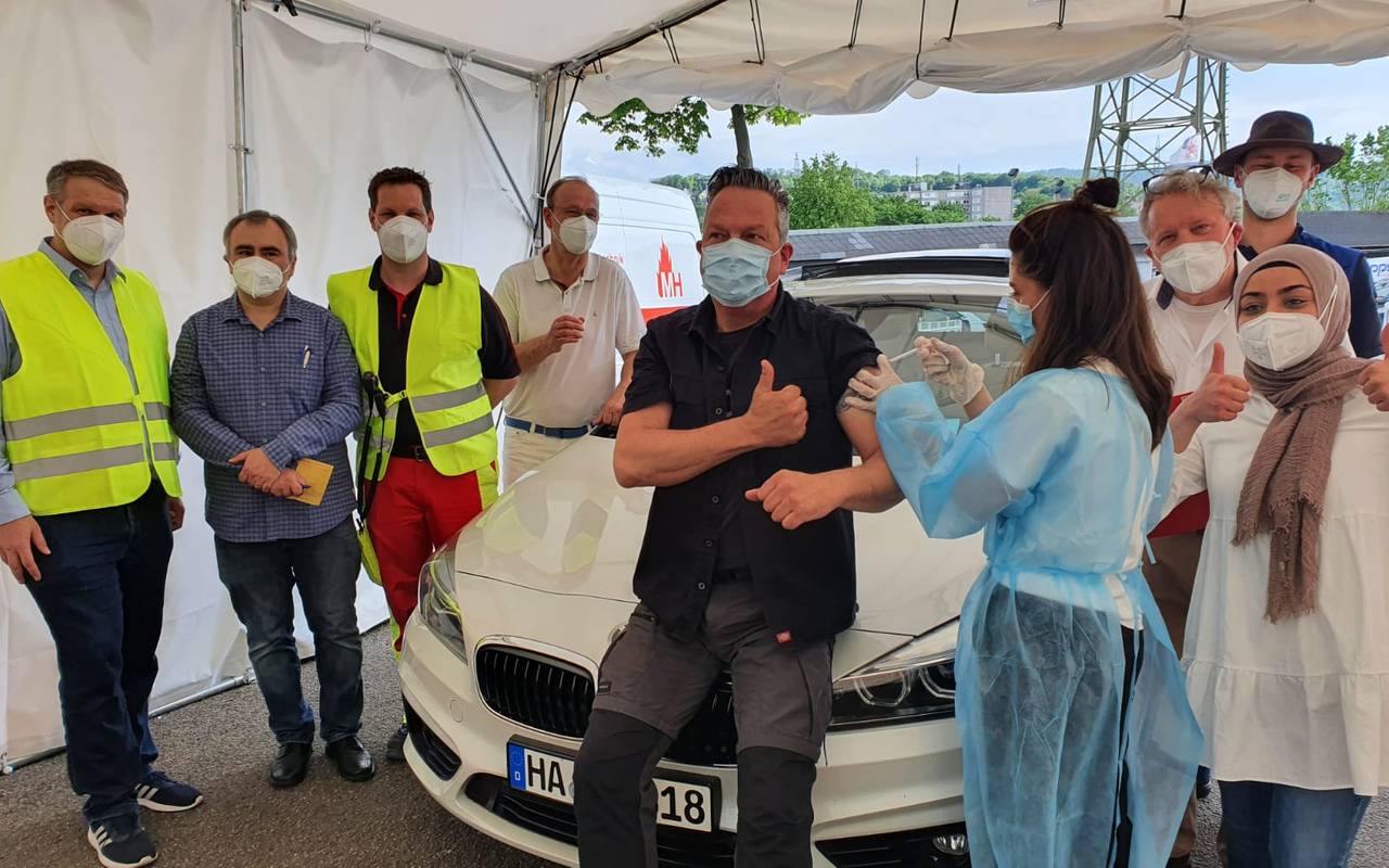 Bei der Drive-In-Impfaktion an Fronleichnam konnten 1.100 Menschen aus Hagen geimpft werden. Die Schnelltestzelte am Kirchenbergstadion wurden dabei wie auch schon an Pfingstmontag zu Impfzelten umfunktioniert.