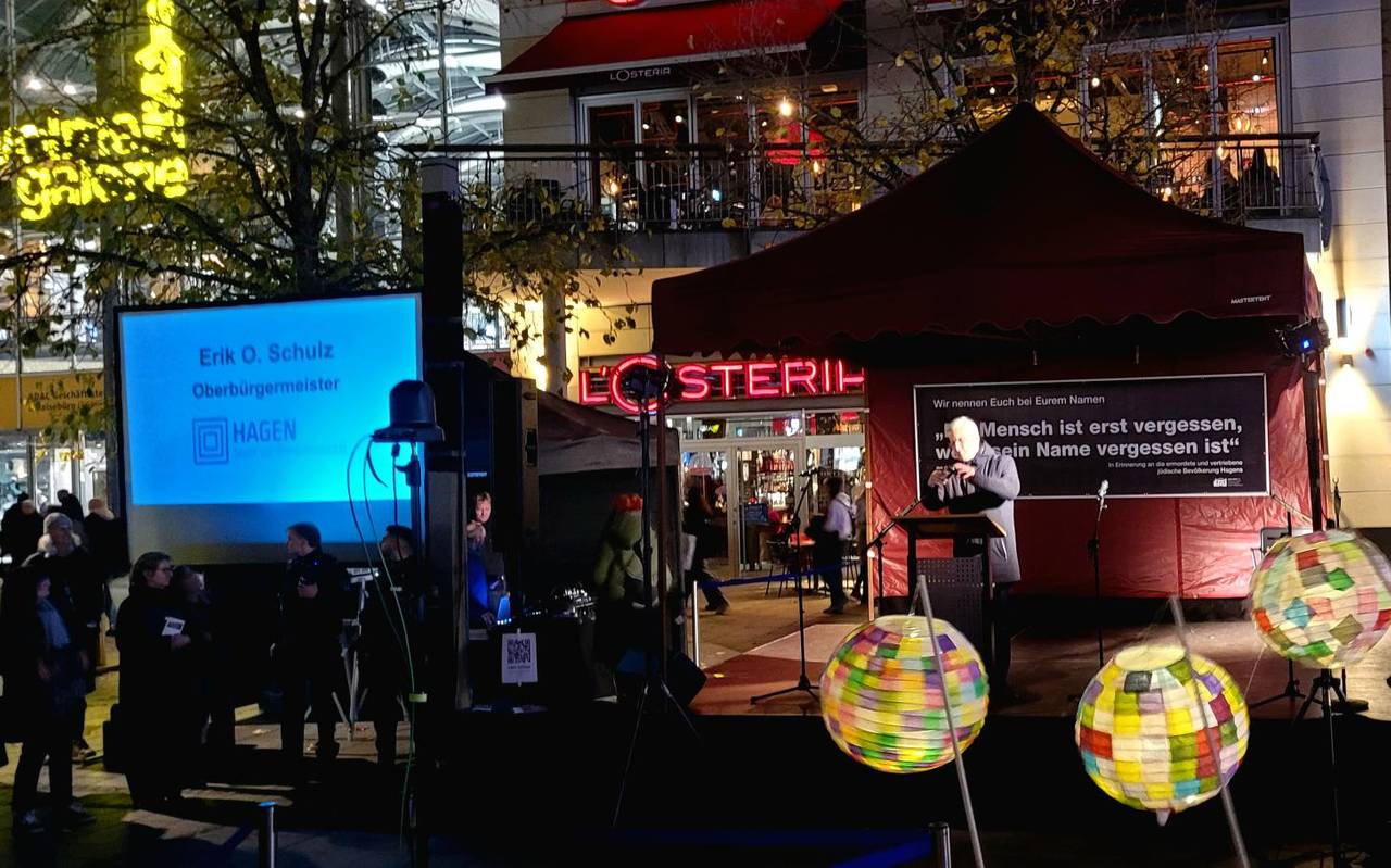 Zum Gedenken an die Pogromnacht gab es am Samstag eine Gedenkveranstaltung auf dem Friedrich-Ebert-Platz. Mitten in der Innenstadt wurden die Namen der deportierten und ermordeten Hagener vorgelesen. Der Rest der Veranstaltung wurde von Schülern von Hagener Schulen gestaltet. So soll auch die junge Generation sich über die Grauen der Geschichte sich informieren und einen Beitrag zur Erinnerungskultur leisten.