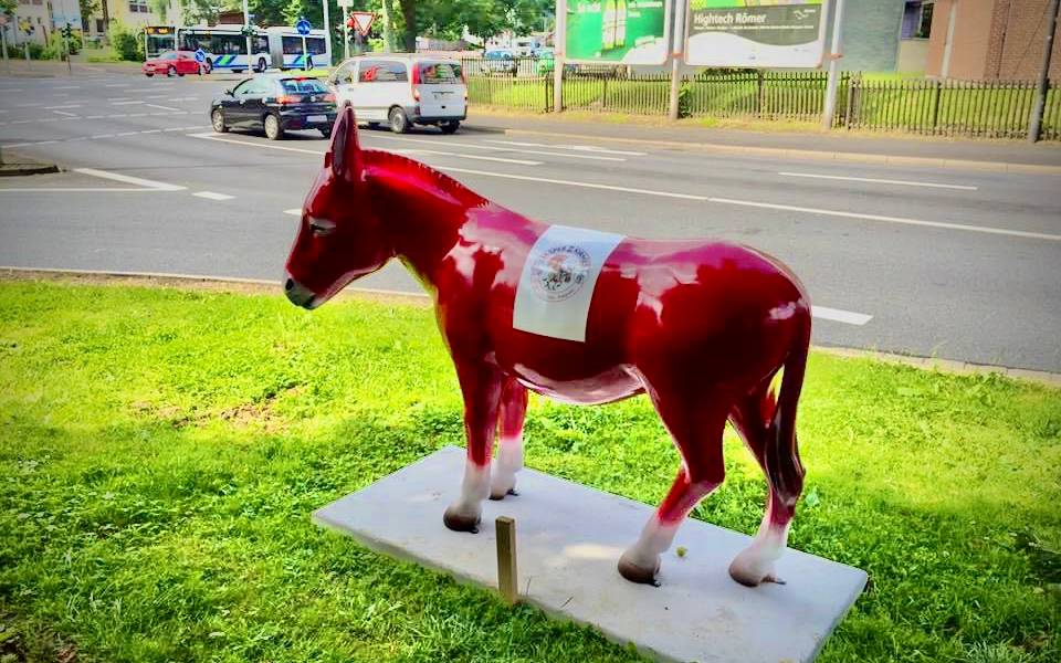Sechs Eselsfiguren sind derzeit in Haspe verteilt. Der knallrote an der Ecke zur Grundschötteler Straße fehlt seit dem Wochenende. Dass die Figuren beschädigt werden, ist der Hasper Heimat- und Brauchtumverein schon fast gewohnt; dessen Experten sind nahezu ständig dabei, Figuren zu reparieren. Falls jemand weiß, wo die Figur herumliegt: sie trägt das Logo des Brauchtumvereins und der Hagener Schausteller auf dem Rücken - und die beiden möchten den Esel wieder haben.}