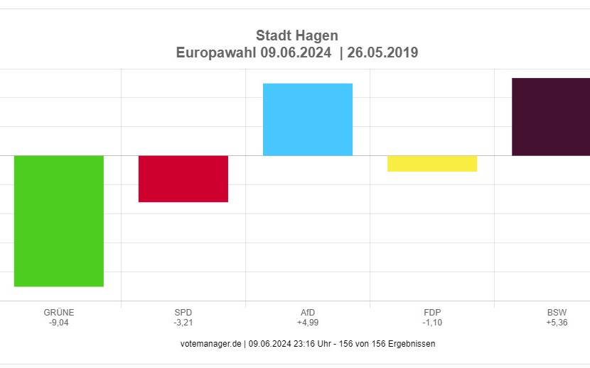 Die Parteien der Ampel-Koalitionen verzeichnen Verluste. Die Grünen sind der große Wahlverlierer in Hagen. Im Vergleich zur letzten Europawahl haben sie knapp die Hälfte ihrer Stimmen verloren. Auch die SPD verliert drei Prozent ihrer Wählerinnen und Wähler. Die FDP verzeichnet ein Minus von knapp ein Prozent. Die AfD verzeichnet in Hagen ein Plus von fünf Prozent. Ähnlich die CDU.