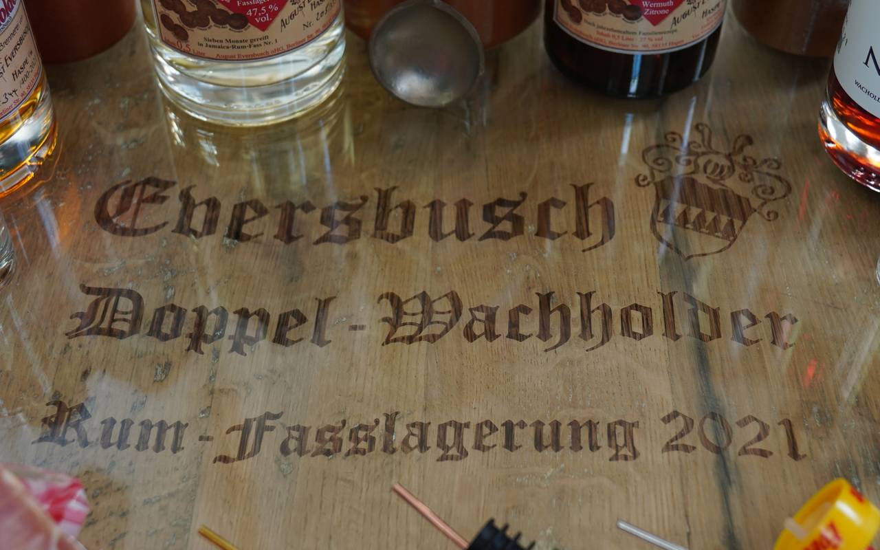 In dem großen Rumfass, das Peter und Christoph Eversbusch bei Ebay versteigern, ist monatelang der Hagener Doppelwacholder gereift. Zum Fass mit Brennereiwappen und Schriftzug kommt eine Glasplatte dazu; so kann man es als Tisch zuhause aufstellen.