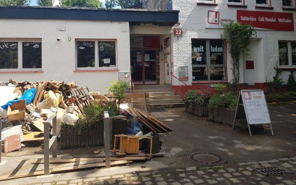 Es wird Monate dauern, bis das Café Mundial, der Weltladen und der Kulturbetrieb im Allerwelthaus die Arbeit wieder aufnehmen können. In einem ersten Schritt müssen die Räume aufwändig getrocknet und dann renoviert werden. Um dafür Platz zu schaffen, werden jetzt Solidaritätstüten verkauft. Das sind Päckchen verschiedener Größen mit Fairtrade-Waren, die beim Unwetter nicht beschädigt wurden. Es geht um Kaffee, Tee, Schokolade, Bio-Lebensmittel, Wein, Öl oder Gewürze. Auch Kunsthandwerk ist dabei. Die Tüten werden am Freitag von 10 bis 18 Uhr und am Samstag von 10 bis 16 Uhr vorm und im Allerwelthaus verkauft.