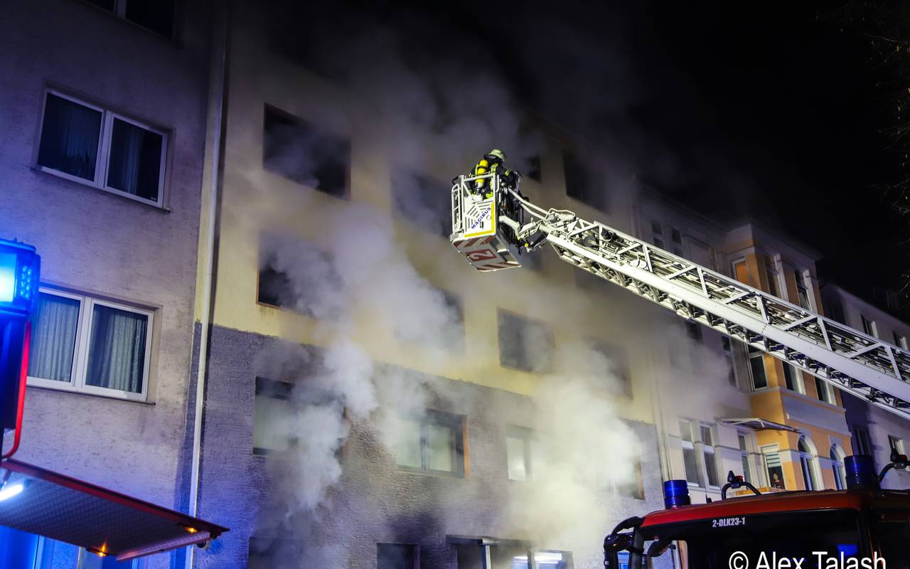 Dramatischen Szenen am Dienstagabend: Als die Feuerwehrleute in der Taubenstraße in Wehringhausen eintreffen, schlagen ihnen Flammen aus Kellerfenstern entgegen.