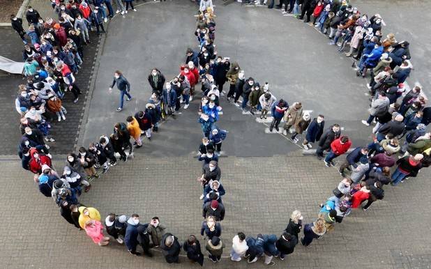Die Gustav-Heinemann-Schule hat eine Themenwoche "Frieden" gestaltet. Ein Punkt dabei: Das lebendige Friedenszeichen.