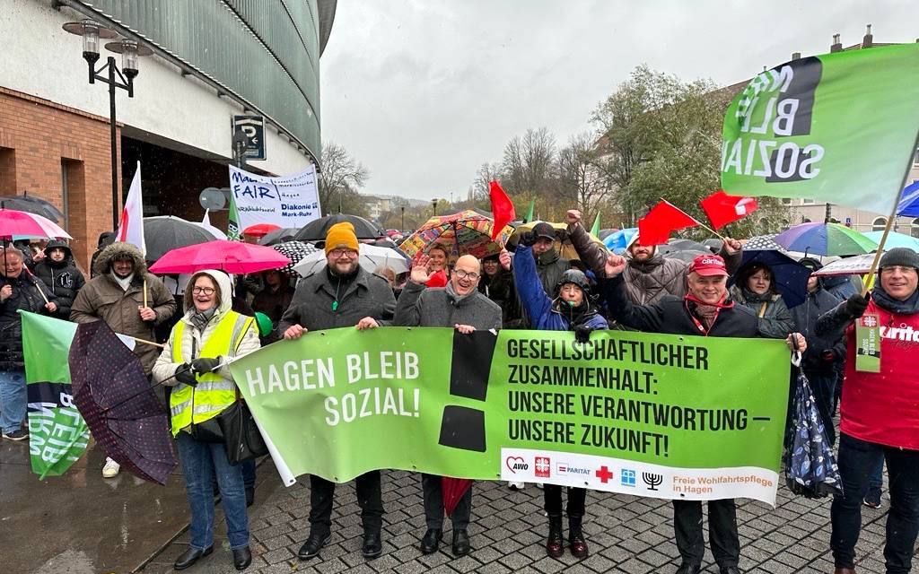 Zu der Demo hatte die Arbeitsgemeinschaft der Freien Wohlfahrtspflege in Hagen aufgerufen. Sie besteht aus AWO, Caritas, Paritätischem, DRK und Diakonie. Die Verbände betreiben unter anderem Kindertagesstätten und offene Ganztagsschulen in Hagen. Außerdem haben sie Angebote der Eingliederungs- und Altenhilfe und verschiedenste andere Beratungsangebote wie z.B. die Schuldnerberatung und die Wohnungslosenhilfe.