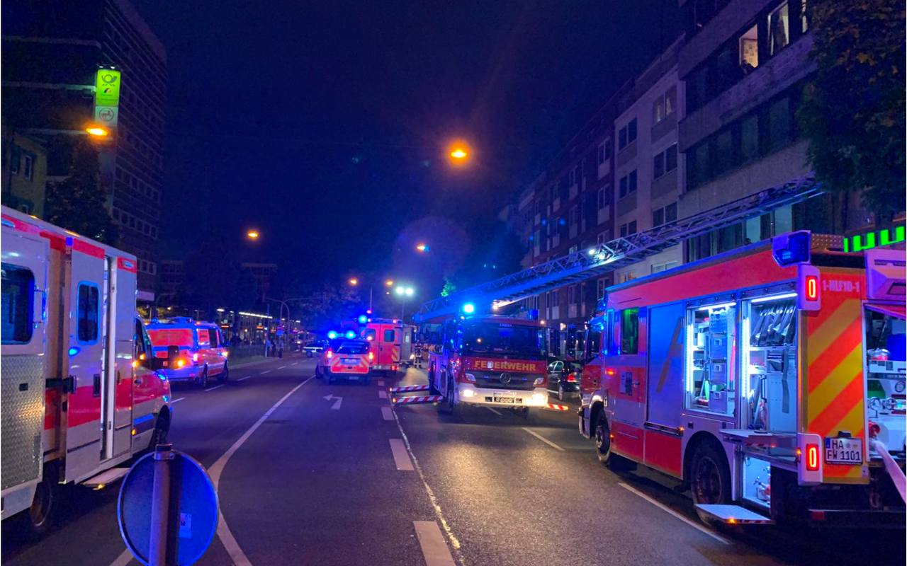 Gegen 2215 Uhr ging der Alarm bei der Feuerwehr ein. Die rückte mit großem Aufgebot an. 12 Menschen wurden über die Drehleiter gerettet; zwei von ihnen kamen ins Krankenhaus. 4 weitere Menschen konnten über den Treppenraum in Sicherheit gebracht werden. Die Feuerwehr setzte ihnen sogenannte Fluchthauben auf, damit sie durch das verqualmte Treppenhaus gehen konnten.