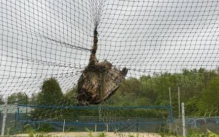 Aus eigener Kraft konnte sich die Eule nicht befreien. Deshalb wurden Polizei und Feuerwehr alarmiert. Die Einsatzkräfte befreiten das entkräftete Tier. Jetzt wird es in einer Wildvogelstation artgerecht versorgt und wieder aufgepäppelt.