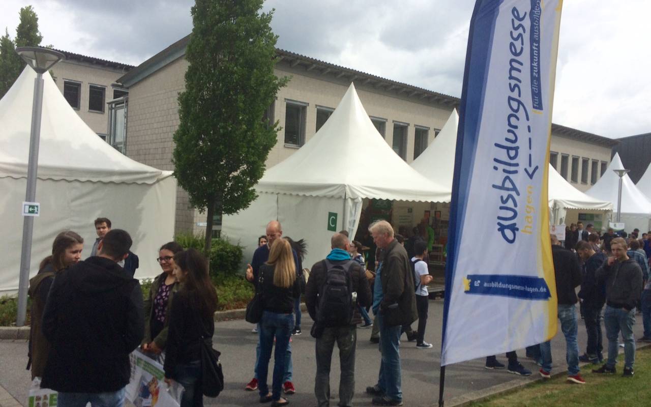Möglich war das ganze heute bei der Hagener Ausbildungsmesse. Rund 100 Stände waren auf dem Elbersgelände verteilt. War fast nicht zu übersehen diese ganzen aneinander gereihten Zelte. Veranstaltet wurde das ganze von der Agentur mark. Die Geschäftsführerin Kerstin Kling erzählt uns, wozu es diese Messe überhaupt gibt...