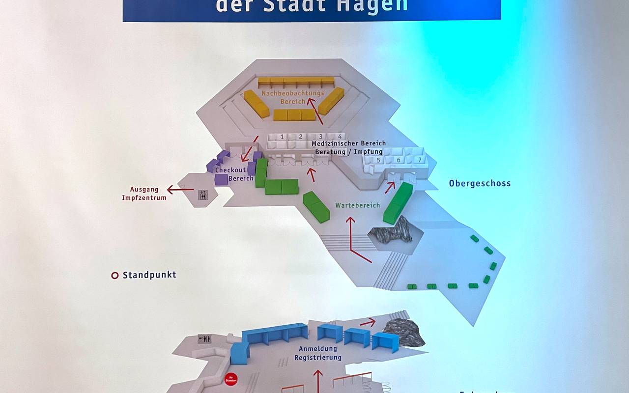 Das Hagener Impfzentrum ist fertig und einsatzbereit. In der Stadthalle haben die Stadt, die Stadthallencrew, Hagens Gebäudewirtschaft und die Kassenärztliche Vereinigung alle Voraussetzungen dafür geschaffen, dass 1000 Leute pro Tag gegen Corona geimpft werden können. Nun fehlt noch der Impfstoff.