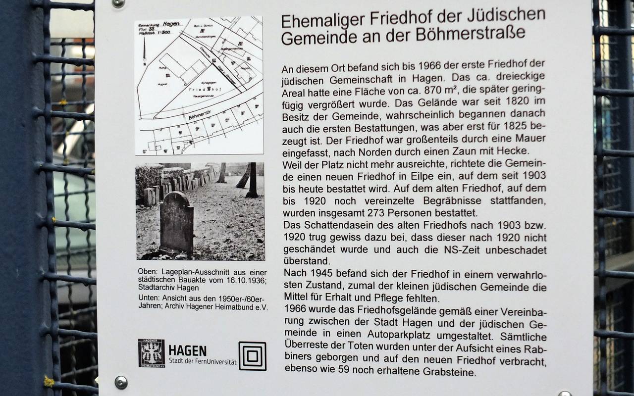 Der erste Friedhof der jüdischen Gemeinde in Hagen war mitten in der Stadt. Am Kreuzungsbereich von Bergischem Ring, Hoch- und Böhmerstraße macht nun ein Infoschild darauf aufmerksam. Garagen und Parkplätze prägen mittlerweile das Bild an der Böhmerstraße.