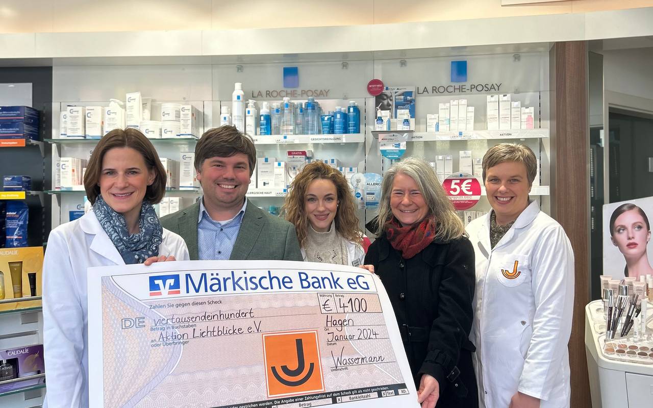 Das ist doch mal ein schöner Jahresstart für unsere Aktion Lichtblicke. Fast Tradition ist der Scheck der J-Apotheken um Friedrich Wassermann. 4.100€ für den guten Zweck. Gesammelt wurde erneut in der Adventszeit. Anstatt ihre Taler gegen Prämien einzulösen, hatten Kundinnen und Kunden die Möglichkeit, sie zu spenden.
