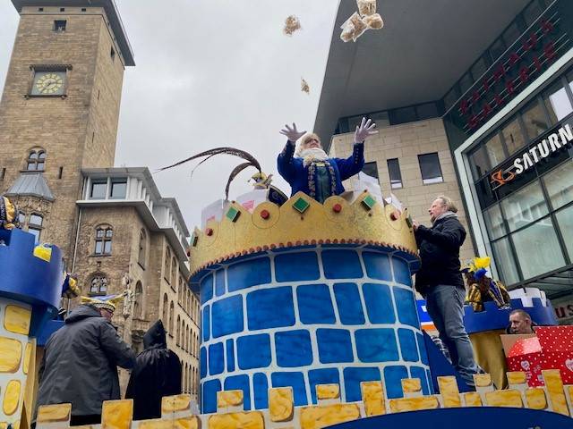 Hagen Hagau! Auch in der Hagener Innenstadt fand nach der langen Pause endlich wieder der bekannte Rosenmontags-Umzug statt. Um 14 Uhr haben sich Festwagen, Fußgruppen und Musikanten auf den Weg gemacht, vorher gab es die feierliche Schlüsselübergabe an das Prinzenpaar Robin und Mandy. Mit dem Zug ging es von der Frankfurter Straße aus quer durch die Stadt Richtung Wehringhausen, die Polizei spricht von einem friedlichen und fröhlichen Verlauf. Kurz nach dem Start musste allerdings wegen eines medizinischen Zwischenfalls auf einem Festwagen pausiert werden. In der Innenstadt war es nach pandemiebedingter Pause wieder richtig voll, vor allem die Kinder hatten sich bunt kostümiert.