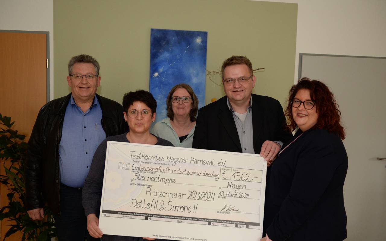 Das Hagener Prinzenpaar unterstützt die Sternentreppe. Simone und Detlef haben gestern einen Scheck über 1562 Euro an den Kinder- und Jugendhospizdienst überreicht.