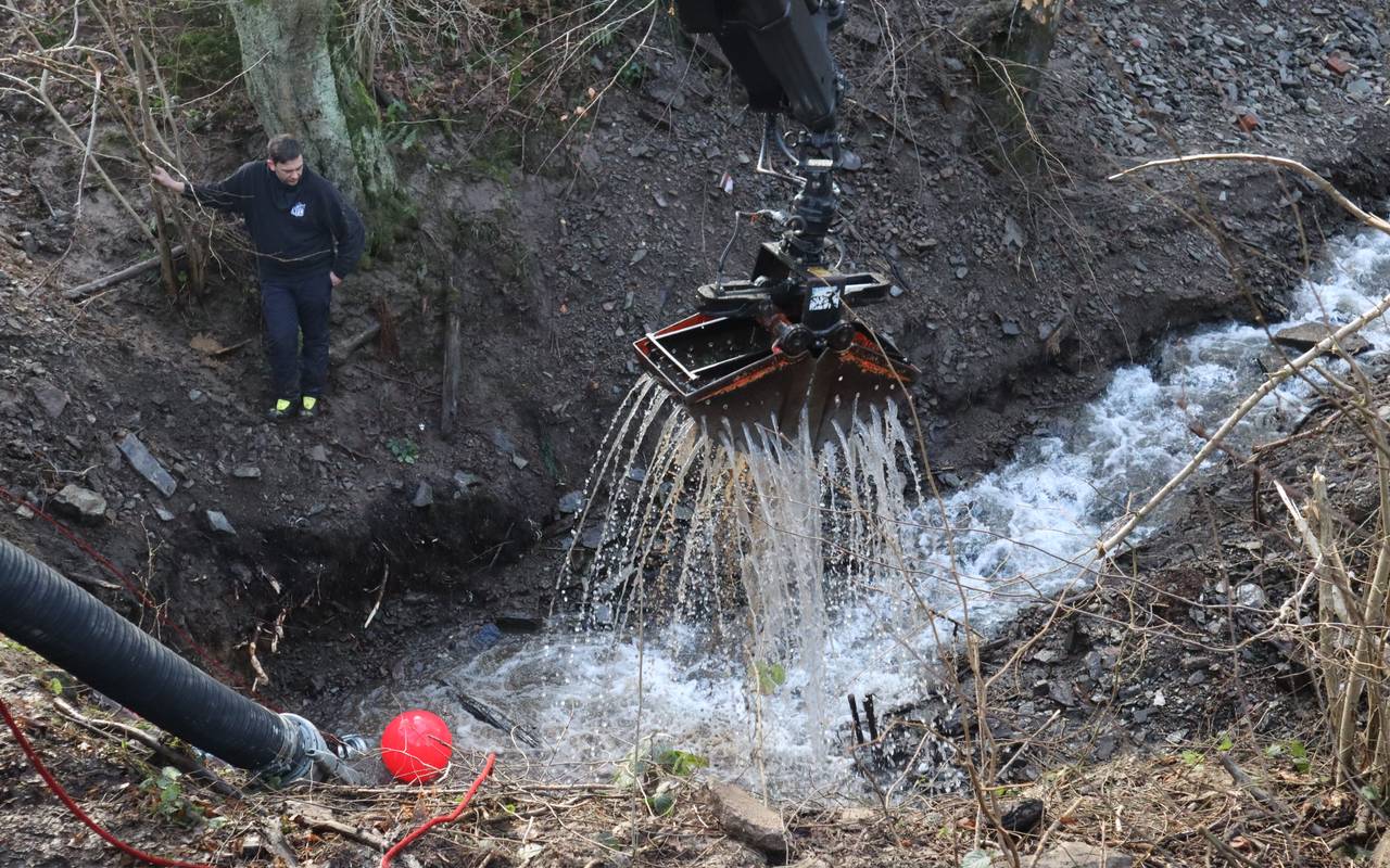 Seit gestern ist die Hagener Feuerwehr vor Ort, um die angrenzenden Häuser vor Überflutungen zu schützen. Seit dem Morgen hilft dabei auch der WBH. Der Grund für das Überlaufen des Baches ist ein eingebrochener Durchlauf unterhalb der Straße. Nun ist der Bachlauf verstopft. Die Feuerwehr und der WBH versuchen ihn deshalb umzuleiten. Wann das erledigt ist, ist allerdings unklar, sagt der Einsatzleiter Michael Funke.
