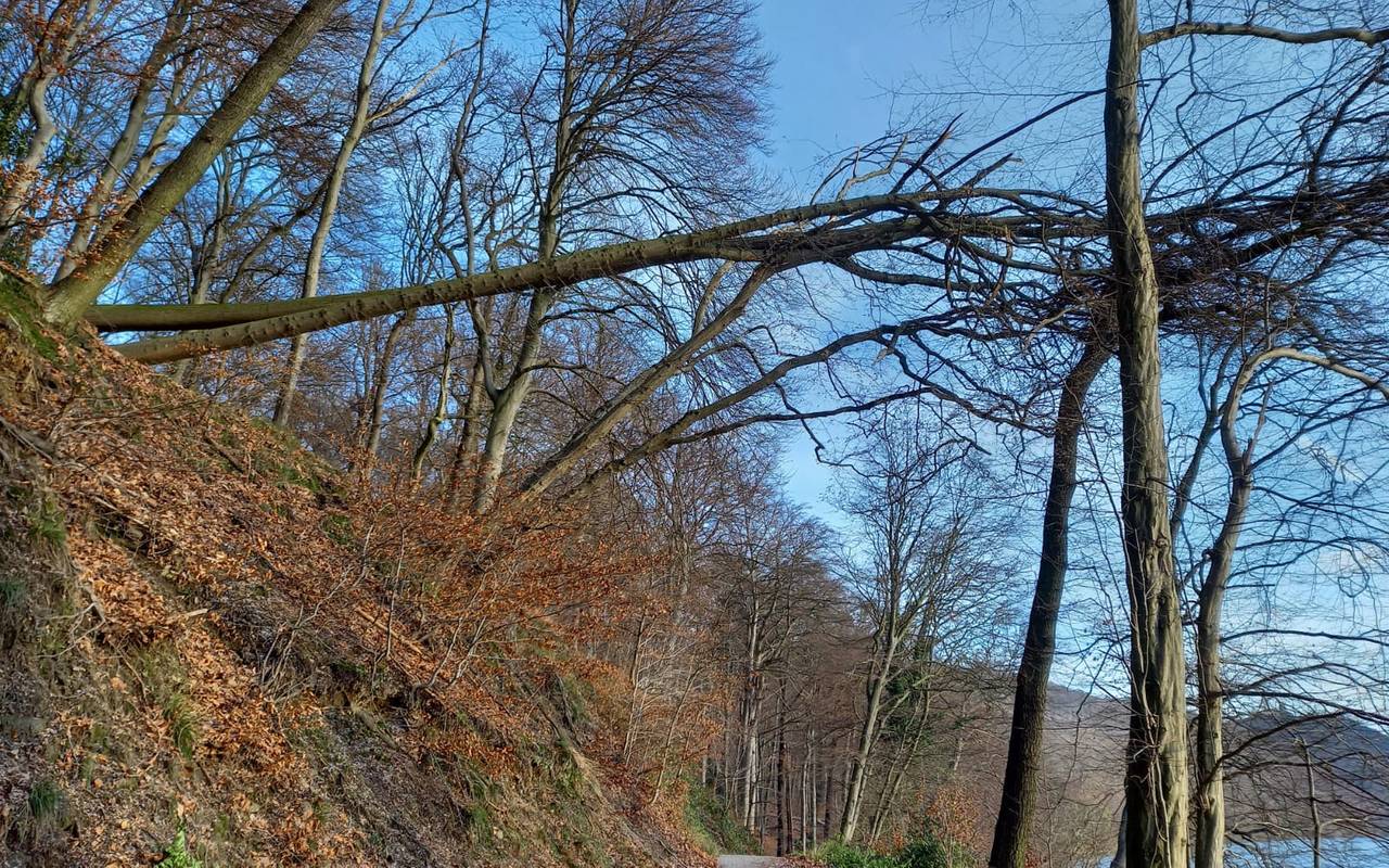 Dort sind mehrere Bäume umgefallen und liegen auf anderen Bäumen am Waldhang. Es besteht die Gefahr, dass die Bäume weiter abrutschen und auf den Seeweg fallen.