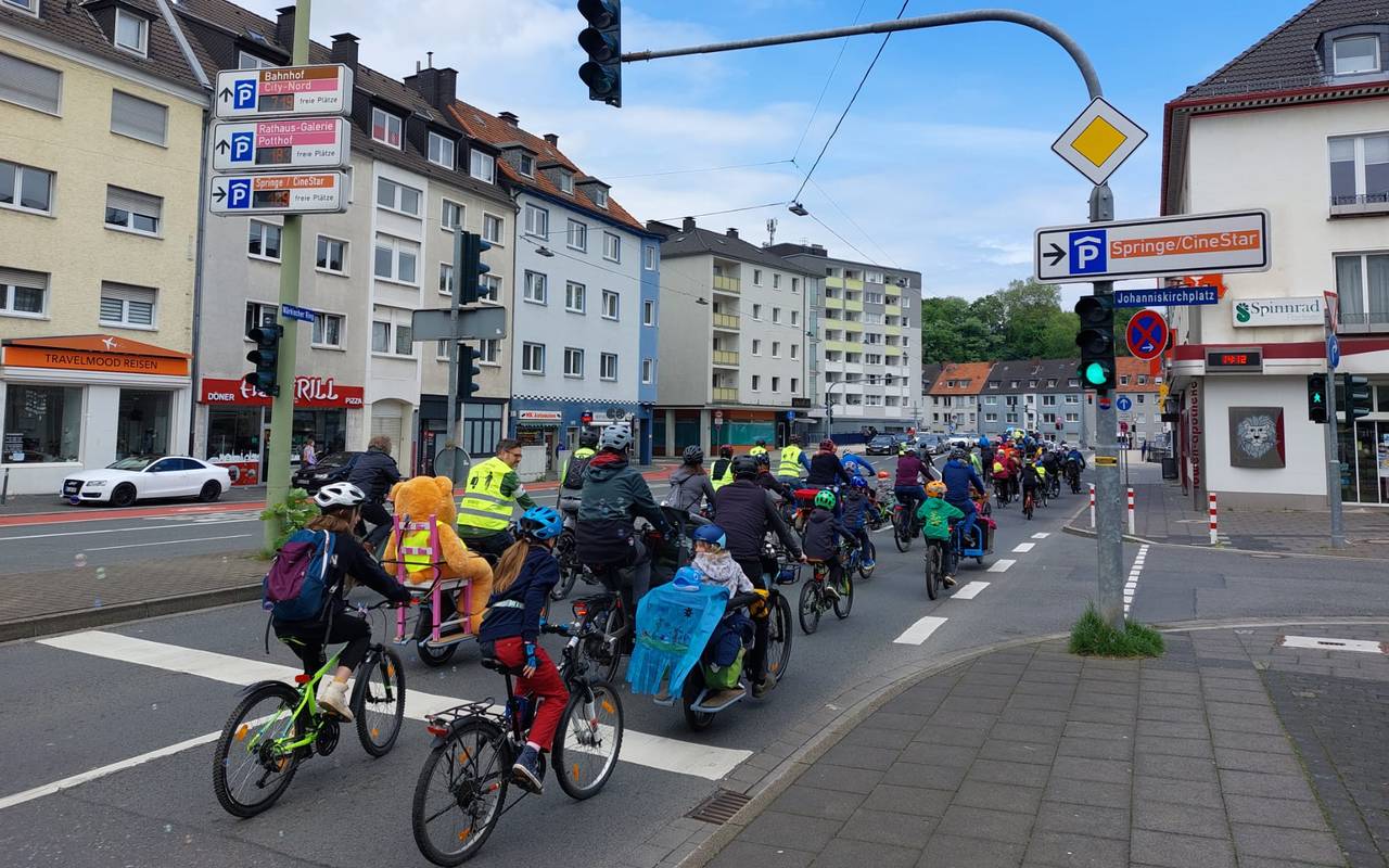 Trotzdem haben sich rund 100 Menschen an der Radtour von der Springe nach Haspe beteiligt. Durch die Innenstadt und über die großen Straßen geht es dabei mit Musik und Seifenblasen. Alles im Sinne der Verkehrswende.