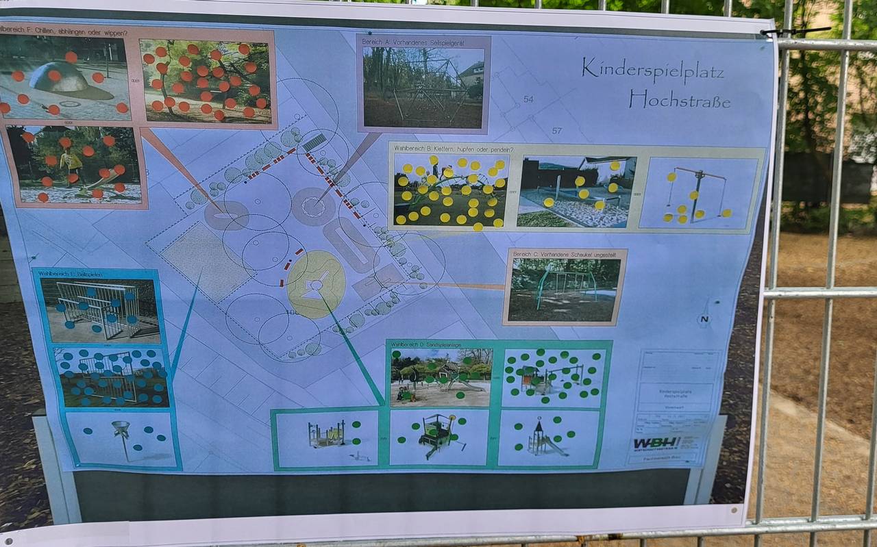 Was soll bleiben? Was kann weg? Das waren die zentralen Fragen, die den Kindern vor Ort gestellt wurden. Das Ergebnis war eine Vielzahl an Ideen, die dann versucht wurden bestmöglich zu bündeln und eine Auswahl zu schaffen. In 4 Kategorien konnten die Kinder dann vor Ort mit kleinen Klebepunkten abstimmen, welche Spielgeräte sie auf ihrem Spielplatz haben möchten. So kamen ein Kletterbogen, eine Hängematte und ein neues, großflächiges Sandspielgerät inklusive Bagger hinzu. Geblieben ist die beliebte Seilanlage zum Klettern, die rote Rutsche, eine Federwippe und die Schaukeln. Diese wurden teils versetzt. um die Fläche bestmöglich nutzen zu kommen.