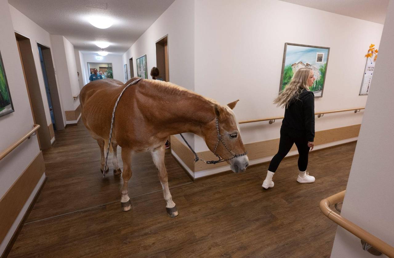 Bückeburg (dpa) - Vorsichtig setzt Wega ihre Hufe auf das dunkle Laminat. Schritt für Schritt wagt sich die Haflinger-Stute in das Foyer des Pflegeheims in Bückeburg im niedersächsischen Landkreis Schaumburg vor. Das Klackern der Hufeisen führt zu ersten neugierigen Blicken. «Kommt ruhig näher heran, sie ist ganz vorsichtig», ruft Nele Plaßmeier den noch etwas zurückhaltenden Bewohnerinnen und Bewohnern zu, während sie ihr Pferd nur locker am Strick führt.