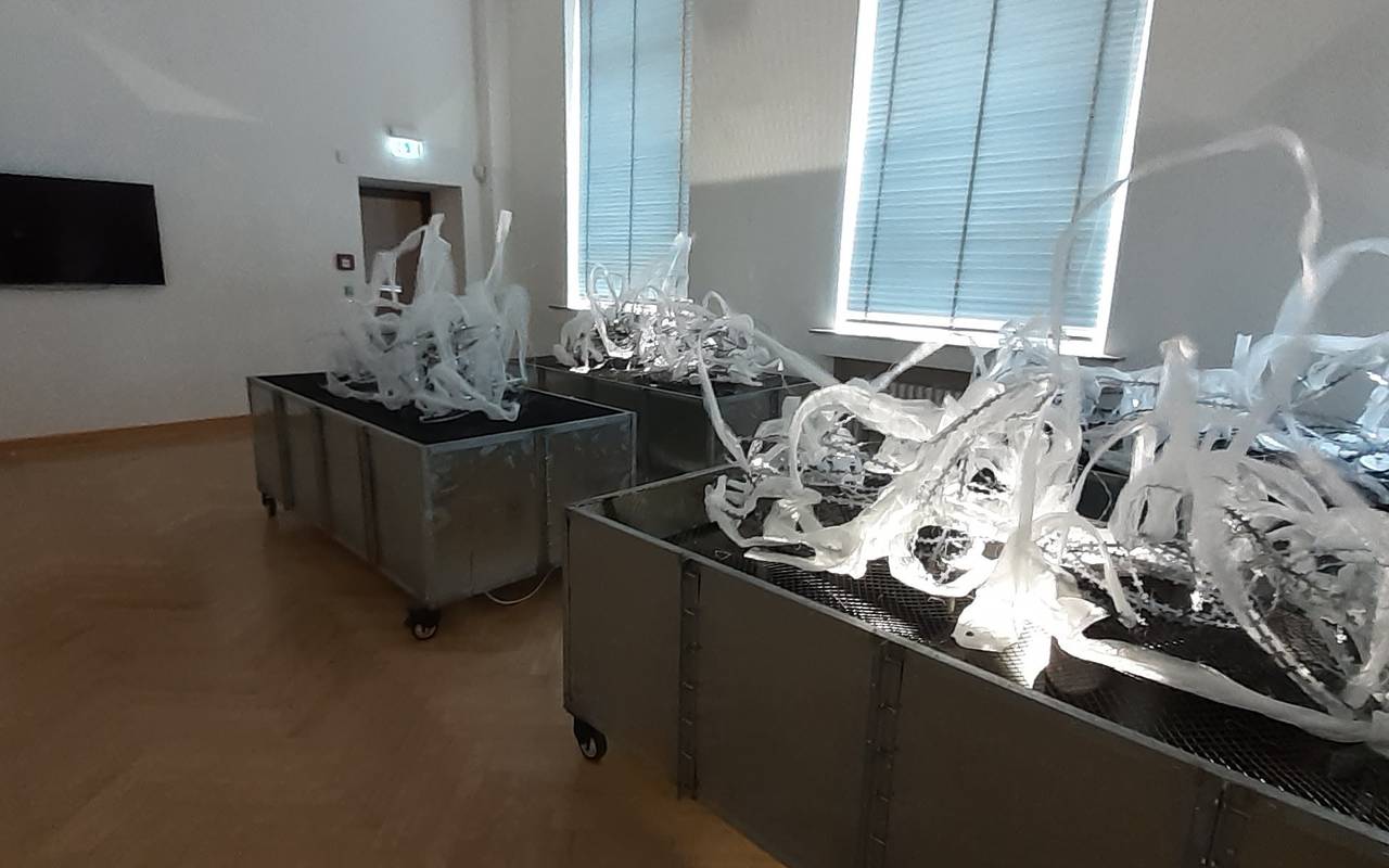 Ein Mann, der fast wie im Musikvideo mit einem Stock rhythmisch auf Sauerstoffflaschen einschlägt. Eine Art Paravent aus Nato-Draht, der mit Schweinwerfern beleuchtet an schwer bewachte Grenzzäune erinnert. Oder auch dreidimensionale Werke aus diesem Nato-Draht, über denen Gazestreifen wehen und aus denen einfach Lärm ertönt.