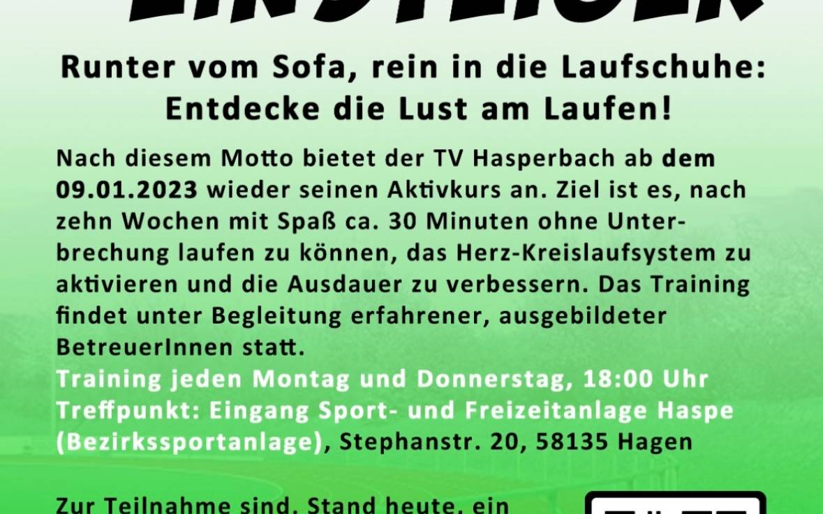 Das anstehende neue Jahr kann man direkt mit Sport beginnen. Der TV Hasperbach bietet ab dem 9ten Januar einen Laufkurs für Einsteiger an. Man muss nur den Weg zur Hasper Bezirkssportanlage finden.