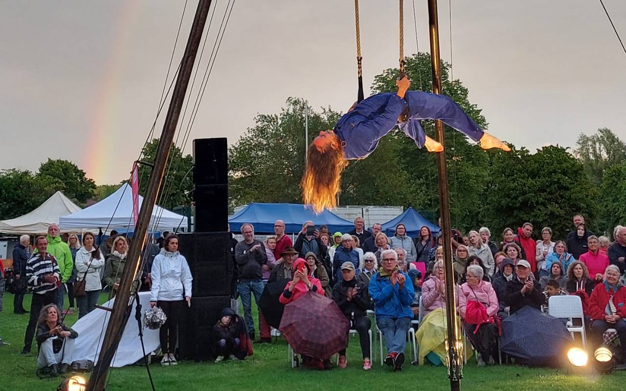Trotz Regen waren einige Besucherinnen und Besucher im Hameckepark zugegen. Luftartistin Jana Korb hat mit einer Mischung aus Artistik am Trapez und Austausch mit den Zuschauerinnen und Zuschauern begeistert. Das Theater Titanic hat kurzzeitig eine sieben Meter große Metallkugel zu ihrer Bühne gemacht.