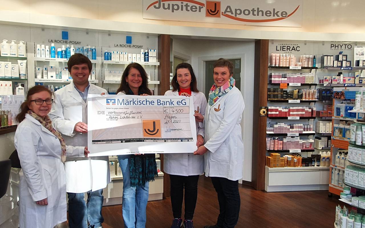 Bei der Aktion Lichtblicke zählt auch jeder Taler. Die Kunden der J.Apotheken konnten das ganze letzte Jahr über ihre Prämientaler oder auch in den Sammeldosen in den Filialen spenden, daraus wurde dann ein Scheck für Lichtblicke. Geschäftsleiter Friedrich Wassermann hat ihn am 21.01.2020 unserer Chefredakteurin Cordula Aßmann überreicht: 4.500€ sind zusammengekommen! Wirklich toll!